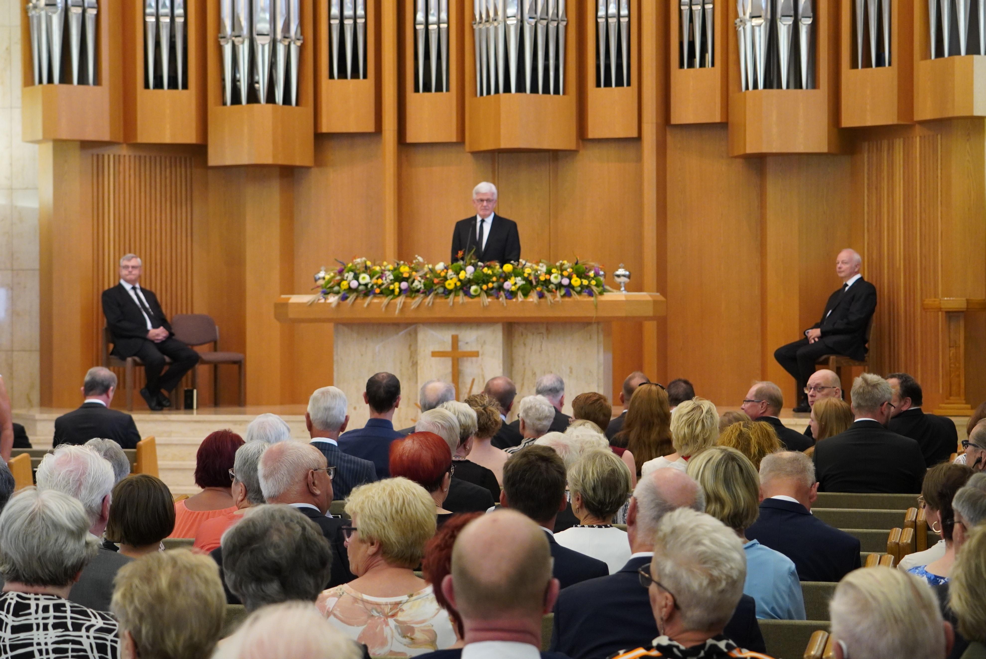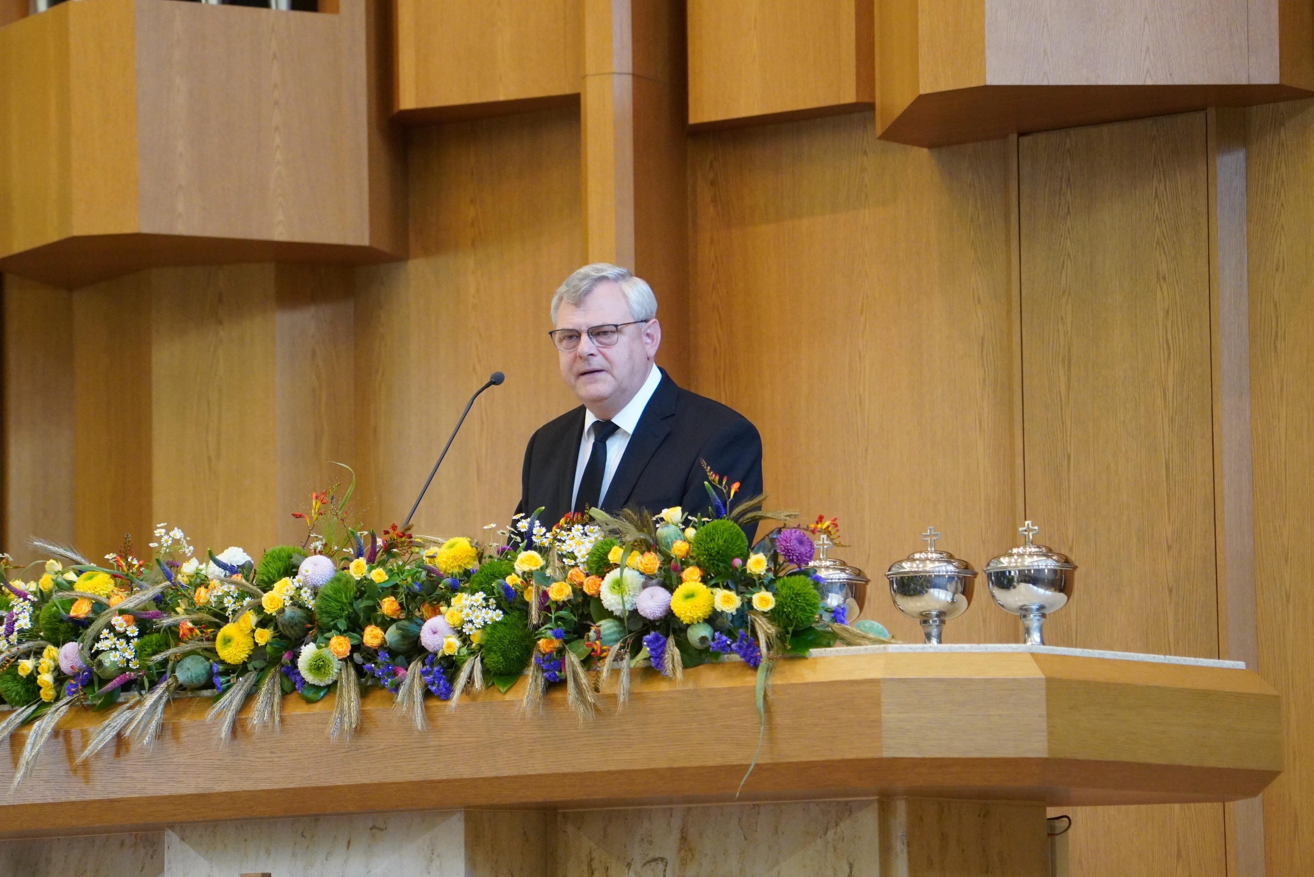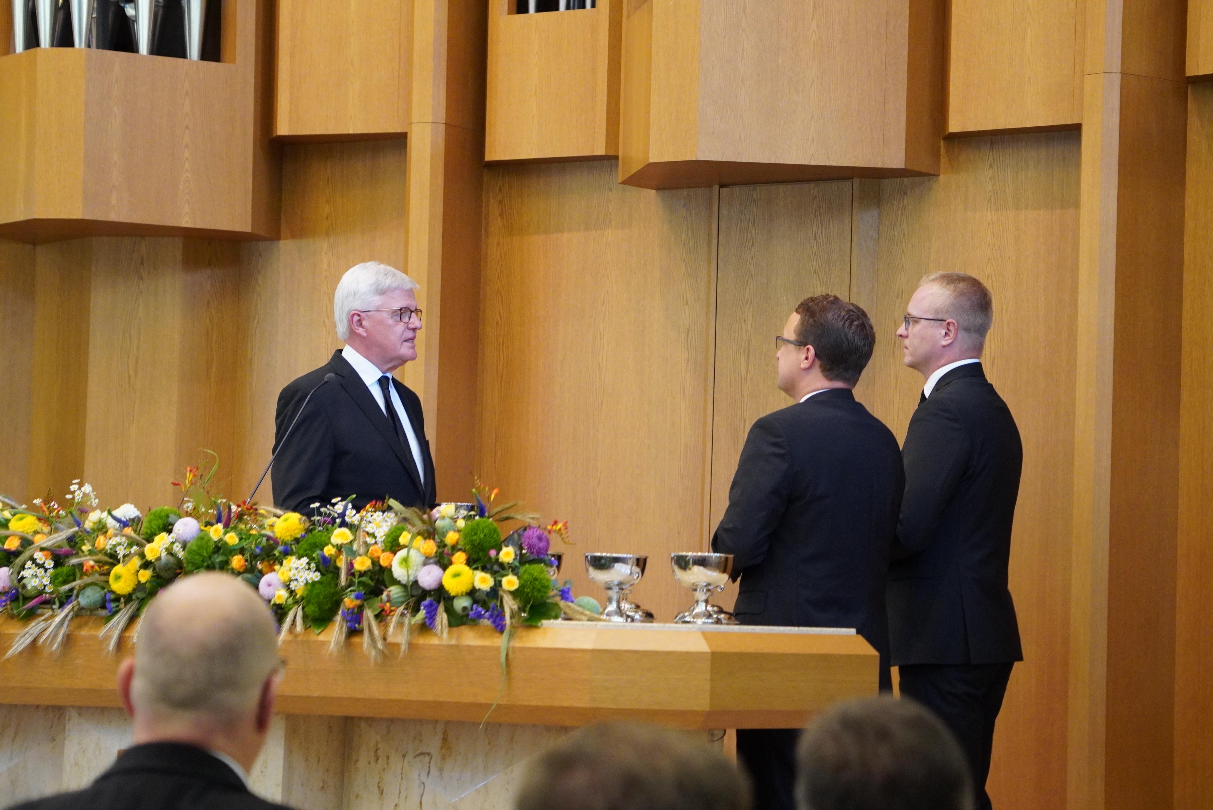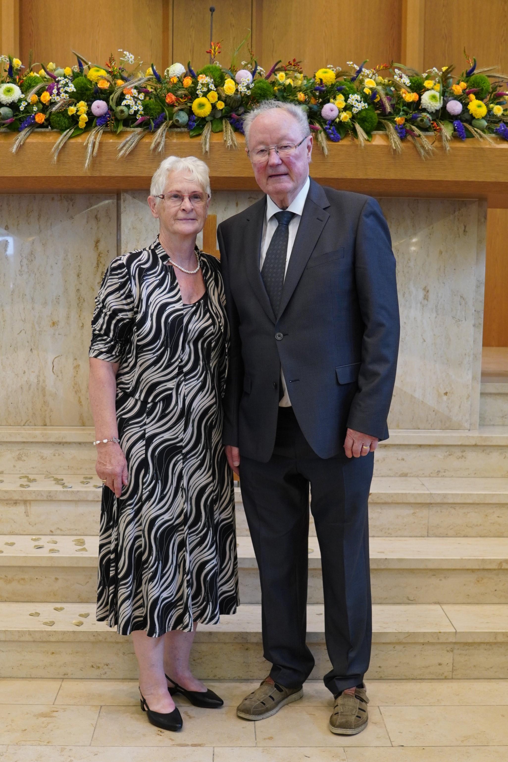 Ein weiterer Höhepunkt des Gottesdienstes war die Segensspendung an Apostel i.R. Gerald Bimberg und seiner Frau zur Goldenen Hochzeit. Apostel Gerald Bimberg war viele Jahre in Sachsen-Anhalt, Sachsen, Polen, Russland und der Slowakei tätig. Immer war er bemüht, die jeweiligen Sprachen zu lernen, um mit den Gemeindemitgliedern in Kontakt treten zu können. Seine Frau Ulla, die vier Kinder und die ganze Familie unterstützten ihn dabei. Der Bezirksapostel hob in diesem Zusammenhang die Opferbereitschaft der Ehefrau und der ganzen Familie hervor und dankte ihnen.