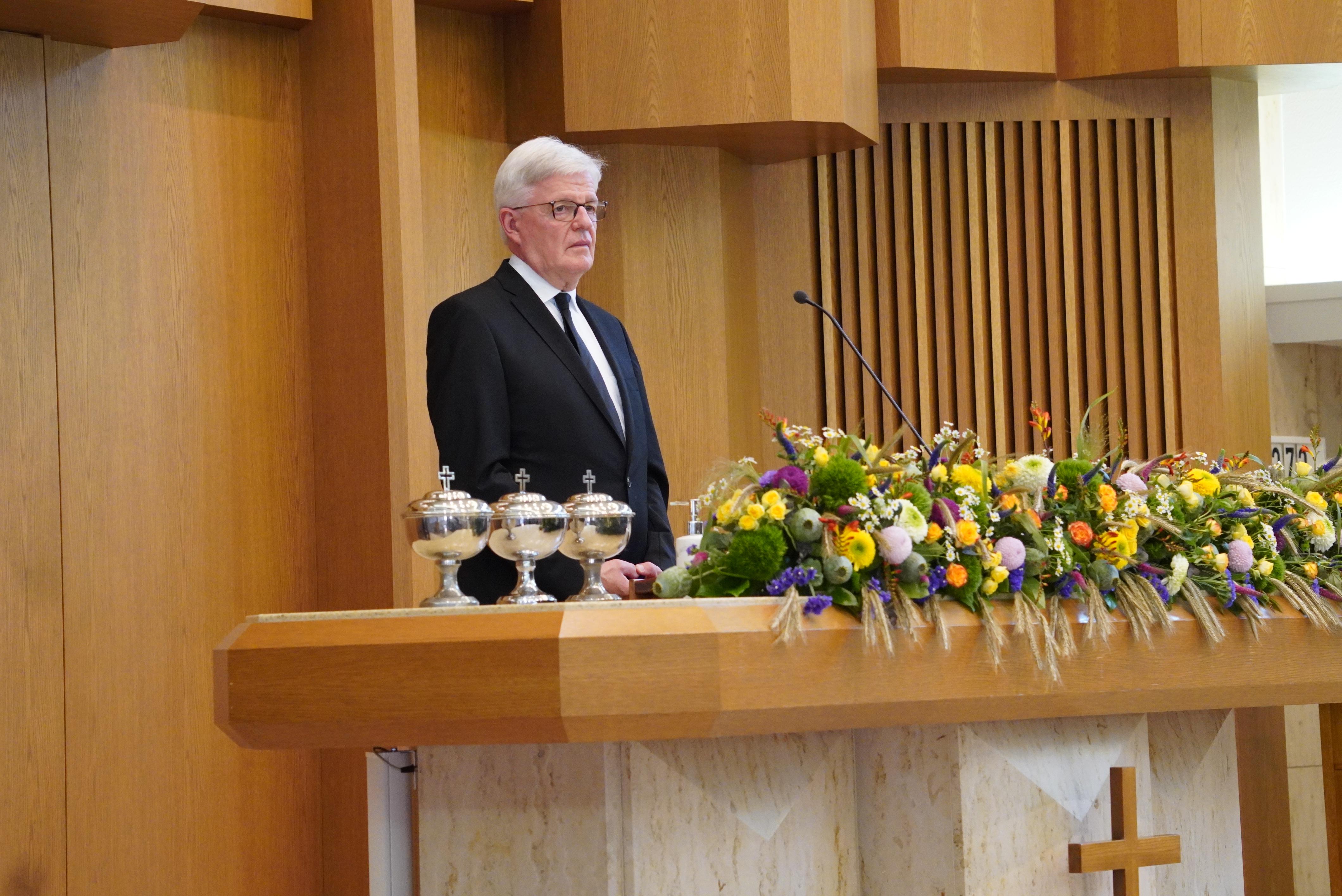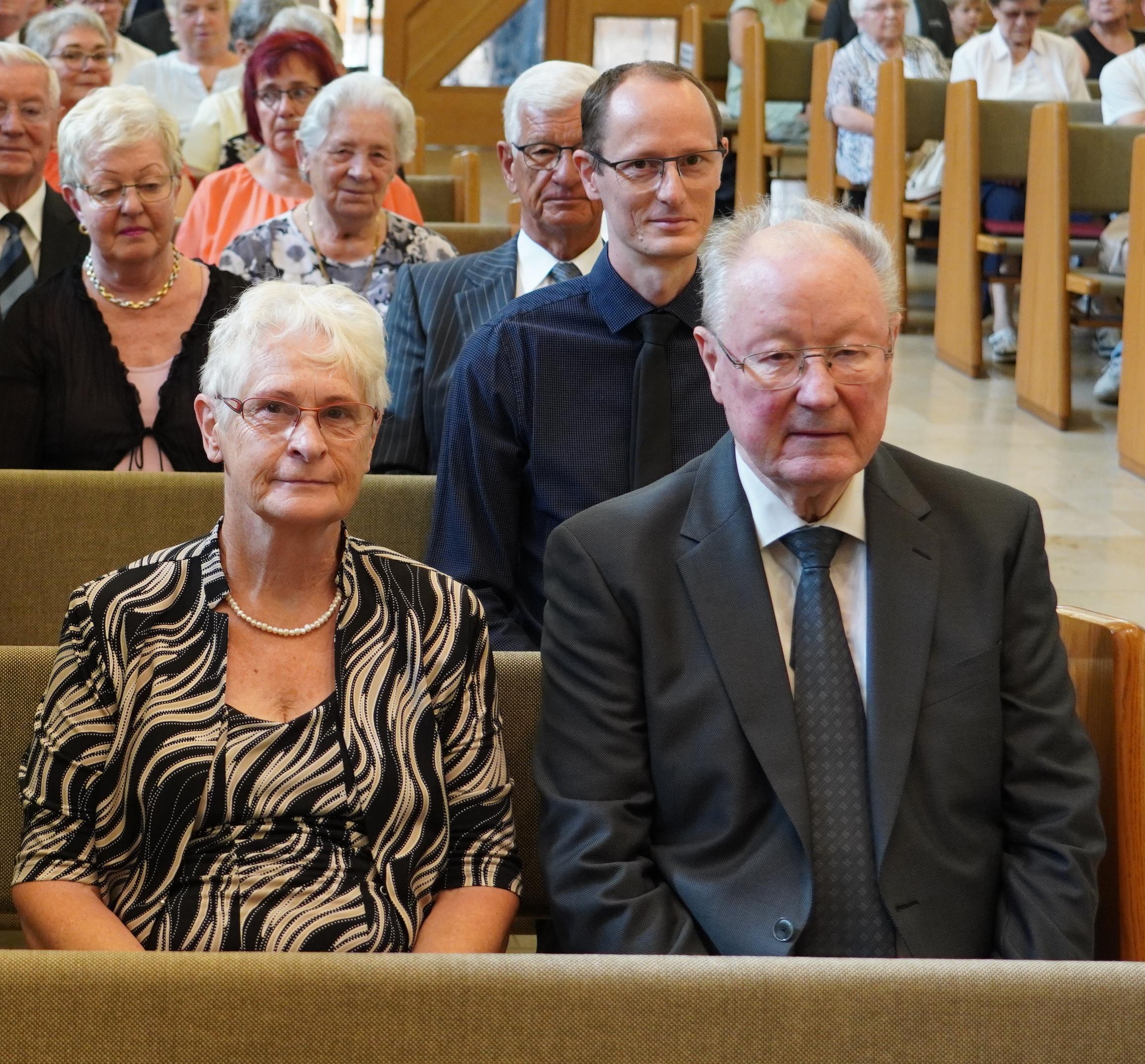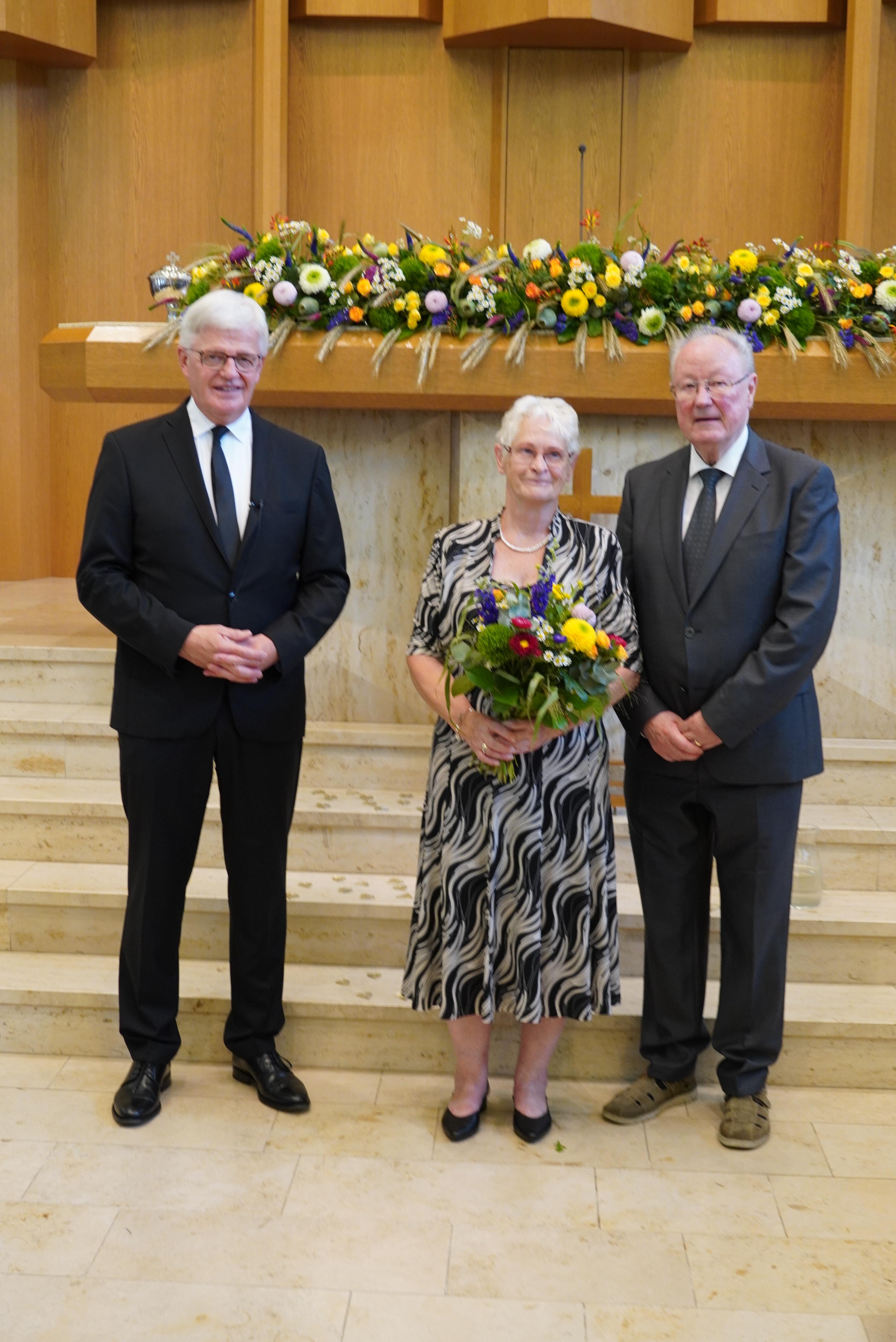 Ein weiterer Höhepunkt des Gottesdienstes war die Segensspendung an Apostel i.R. Gerald Bimberg und seiner Frau zur Goldenen Hochzeit. Apostel Gerald Bimberg war viele Jahre in Sachsen-Anhalt, Sachsen, Polen, Russland und der Slowakei tätig. Immer war er bemüht, die jeweiligen Sprachen zu lernen, um mit den Gemeindemitgliedern in Kontakt treten zu können. Seine Frau Ulla, die vier Kinder und die ganze Familie unterstützten ihn dabei. Der Bezirksapostel hob in diesem Zusammenhang die Opferbereitschaft der Ehefrau und der ganzen Familie hervor und dankte ihnen.